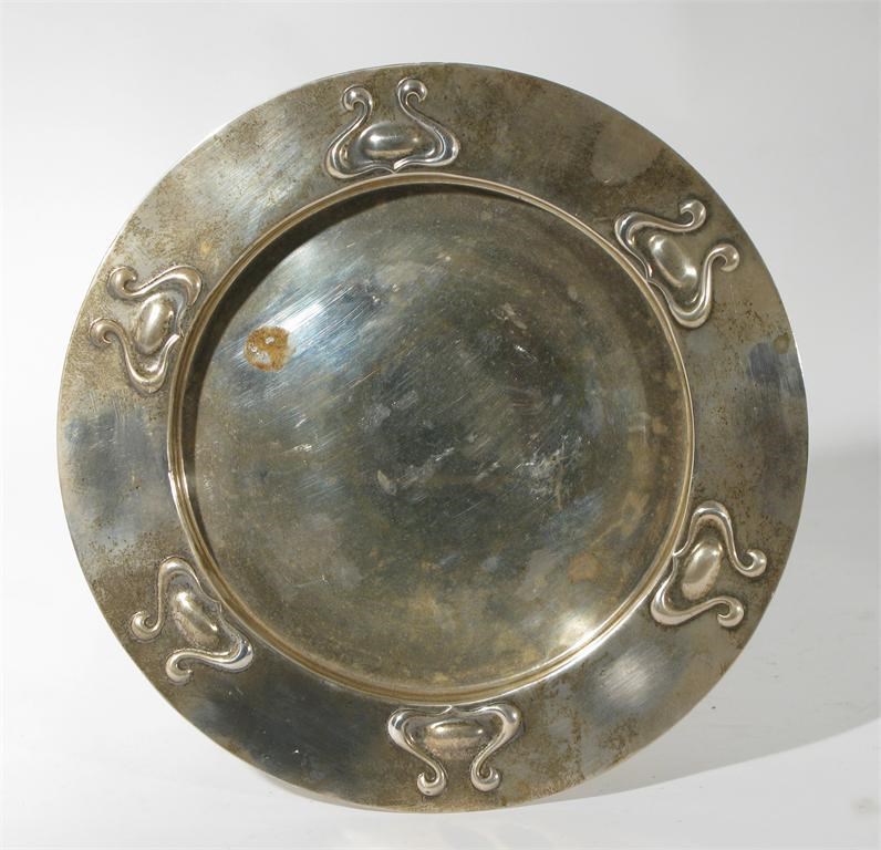 An electroplated metal platter circular form stamped in low relief with flowerhead motif unmarked 27cm. diam.