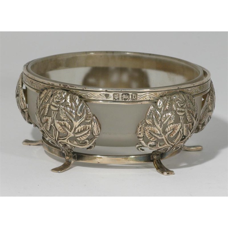 An Artificers Guild silver bowl with glass liner cast in low relief with rose stems stamped marks, London 1923 12cm. diam