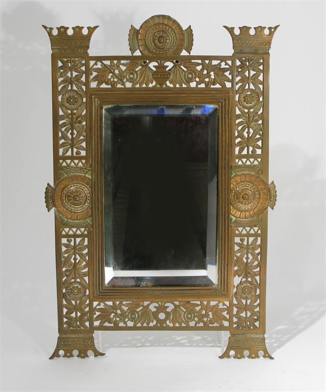 An Aesthetic Movement patinated metal wall mirror rectangular, with pierced foliate border unsigned 40cm. high