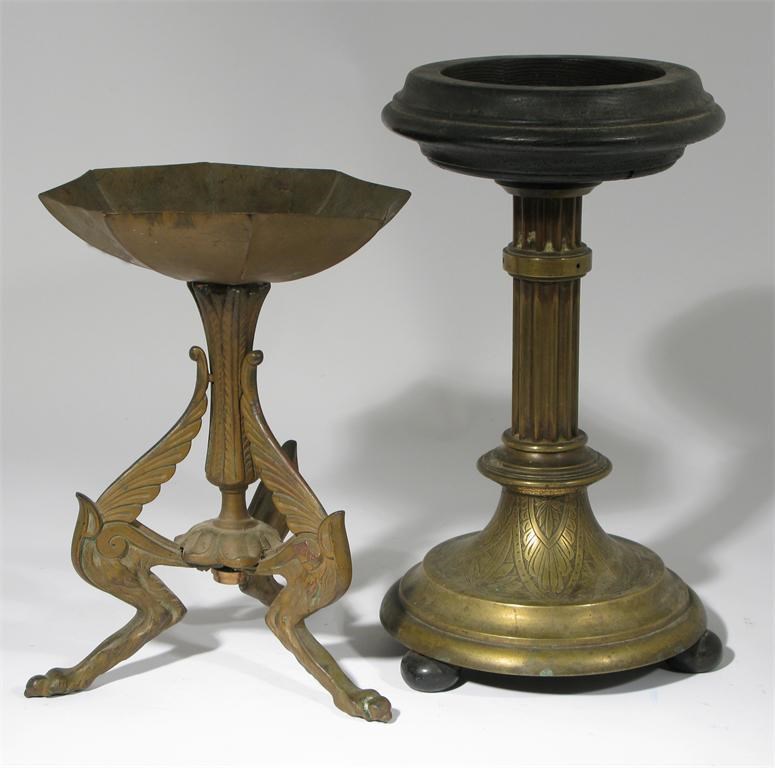 An Aesthetic Movement patinated bronze coupe on tripod form, with patinated copper bow, and another centrepiece unmarked 24.5cm. high