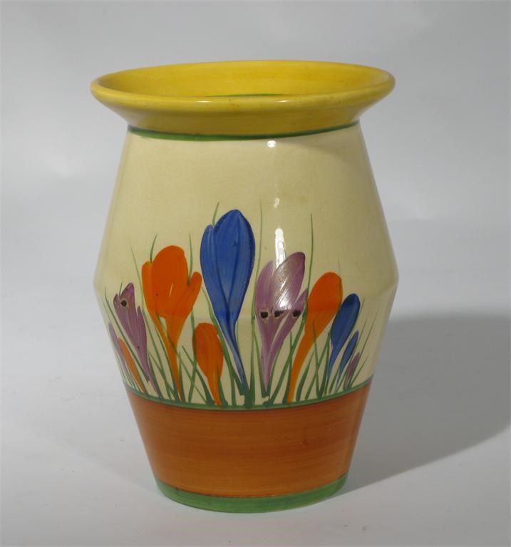 'Crocus' a Clarice Cliff Bizarre 342 vase painted in colours between yellow and brown bands printed and painted mark 20.5cm. high