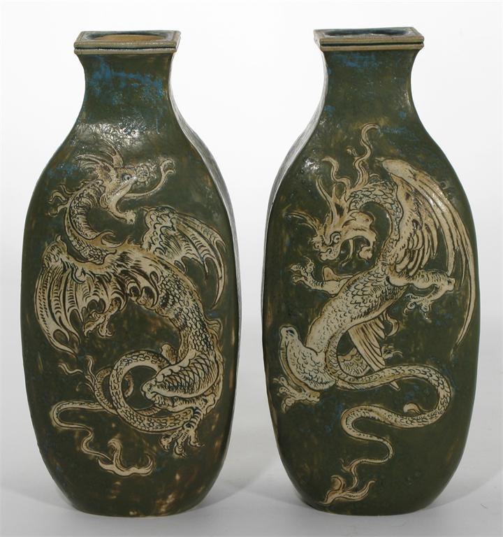 A pair of Martin Brothers stoneware dragon vases slab form with square section necks, incised and painted to both sides with ferocious dragons in browns and ochre on a green ground incised Martin Bros, London & Southall 11 1899 23cm. high