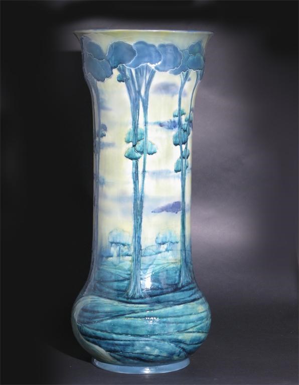 'Hazledene' a massive Moorcroft Pottery vase designed by William Moorcroft for Shreeve & Co San Francisco, swollen low body with tall cylindrical neck and everted rim, painted in shades of green, yellow and blue  painted green signature and Shreeve dedication, restored 65cm. high