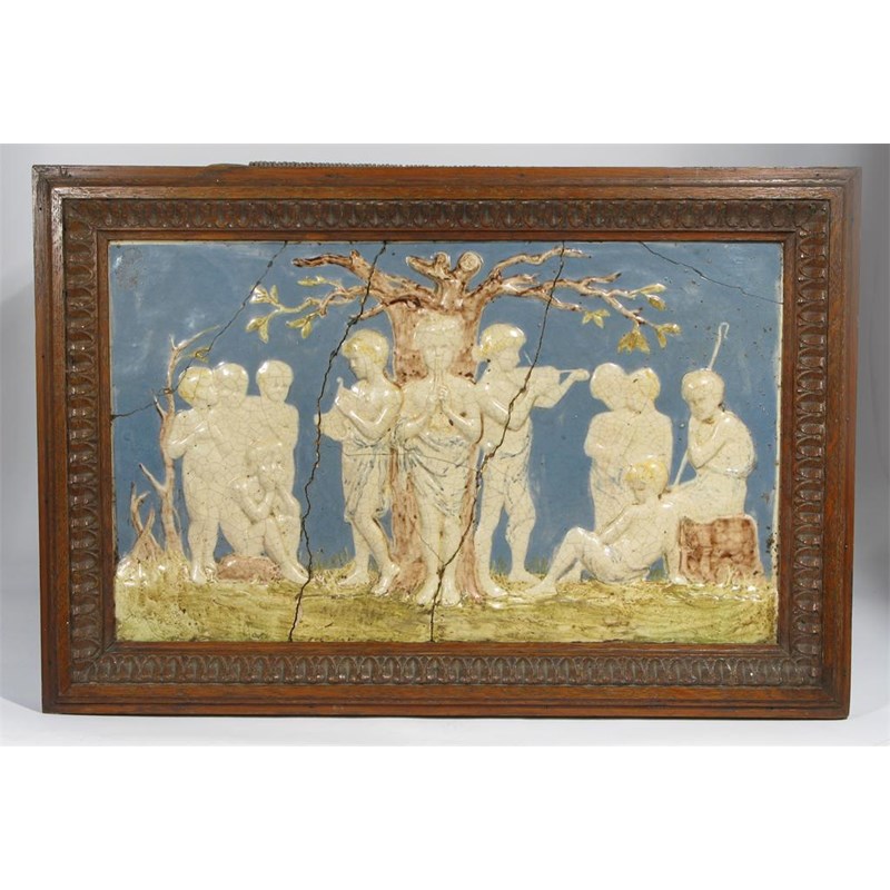 A large Della Robbia pottery plaque modelled in low relief with children playing musical instruments, glazed in colours, framed marks concealed, smashed plaque 48 x 30cm.