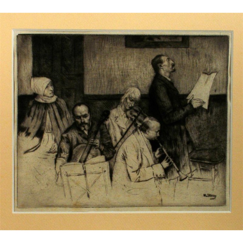 An etching of musicians by William Strang signed in the print image 21 x 17cm.