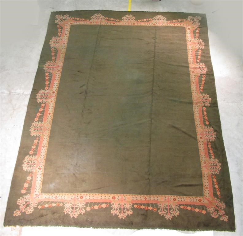 A large Donegal carpet with simple flower and tree border on a green ground unsigned 450 x 332cm.