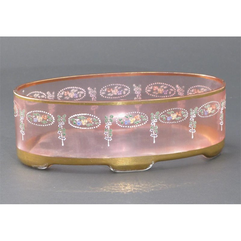 A Haida enamelled glass centrepiece elliptical form, enamelled with flower roundels and pendulous swags, highlighted in gilt unsigned 22cm. wide.