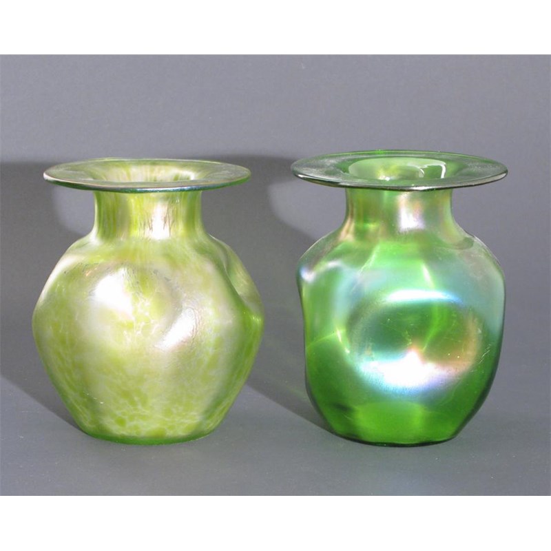 A Loetz glass vase ovoid dimpled body with flaring rim, mottled green glass with light golden iridescence, and another similar probably Palme Koenig, unsigned 16.5cm. high