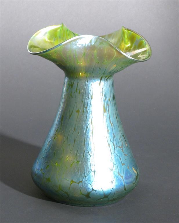 A Loetz iridescent glass vase with pinched trefoil rim, covered in a splashed green iridescence unsigned 20.5cm. high