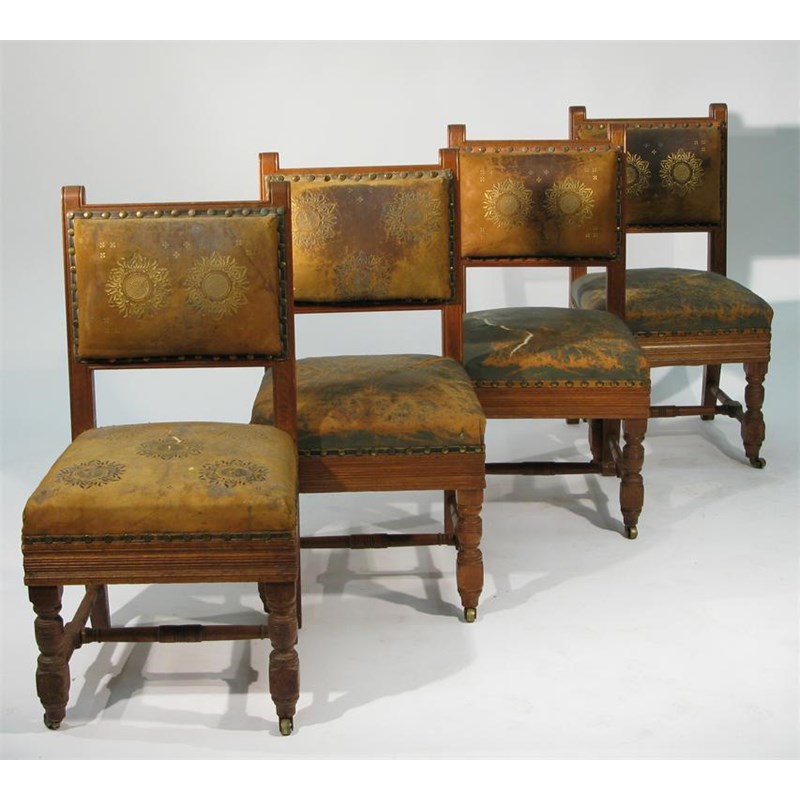 A set of four Gothic reform chairs in the manner of Richard Norman Shaw, with turned legs and stretchers the leather seats and backs with tooled and gilded flowerhead motif unsigned 88cm. high