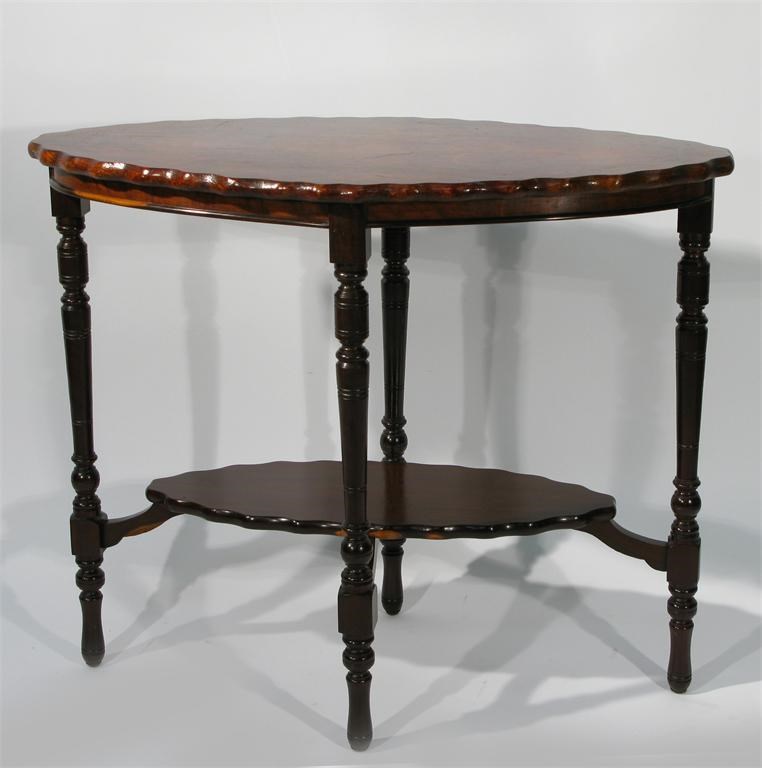 A Burr Yew and Laburnum side table elliptical section with turned legs 74cm. wide