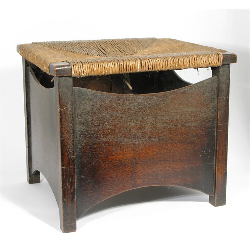 A Glasgow School rush seated stool square section with simple arched side panels 35cm. high