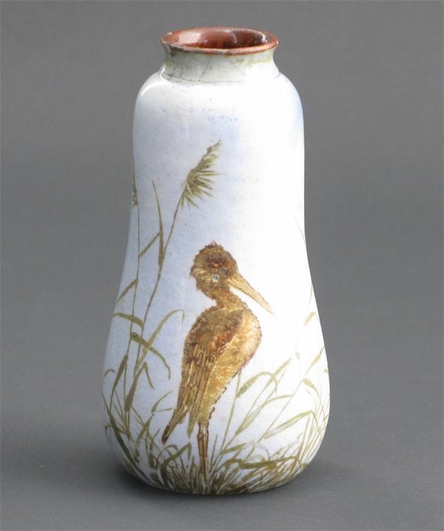 A Martin Brothers stoneware vase painted with birds flying and standing amongst tall grasses, in colours on a pale blue ground incised Martin Bros London & Southall, 12-1895 chip and glaze chips to top rim 13cm. high Provenance John Longden, thence by descent