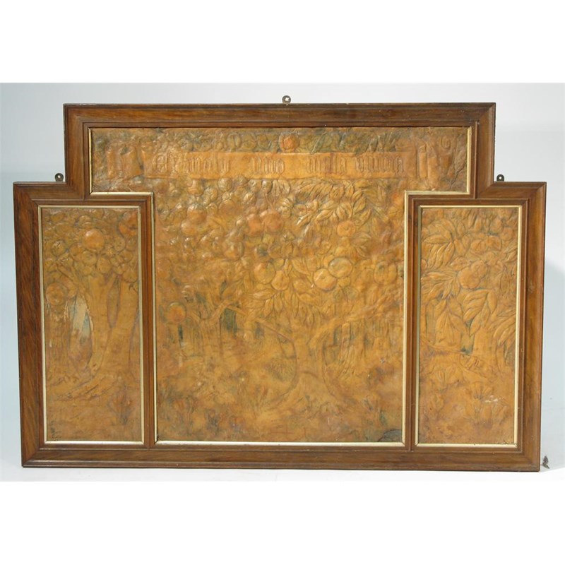 Two tooled leather pictures by Ada Neville-Rolfe one triptych form with fruiting orchard design, and another tooled with birds applied paper label dated 1912 132 x 92cm (orchard panel).