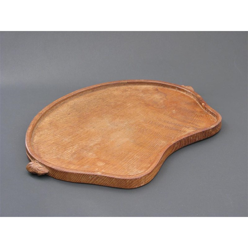 A Robert Mouseman Thompson oak tray kidney shaped, with two carved mice to the rim 48cm. wide