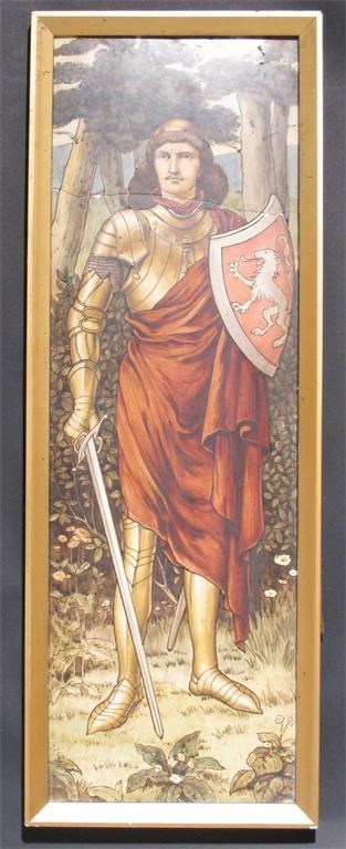 A W.B. Simpson tile panel of a knight painted in colours impressed marks, paper label, cracked in two 62cm. high