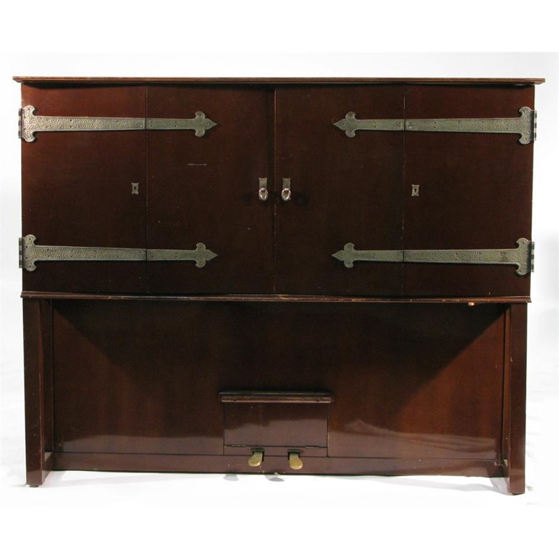 A Ronisch mahogany and sycamore upright pianola possibly designed by Mackay Hugh Baillie Scott, with hammered steel furniture applied factory label 162cm. wide, 130cm. high Literature Fine 20th Century Design, Sotheby's London 2nd April 2008, lot 153 page 166-167 for a comparable Ronisch piano designed by Mackay Hugh Baillie Scott.
