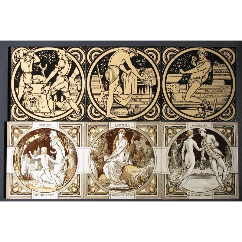 Thomson's Seasons three Minton tiles, designed by John Moyr Smith, comprising Spring, Summer and Winter, and three Minton 'Industrial' series tiles impressed marks, 15.5cm. square