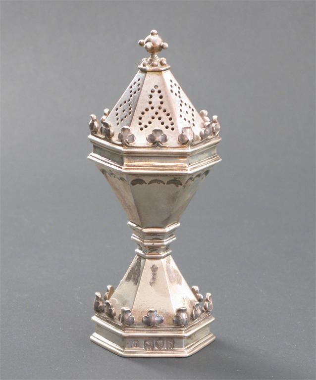 A Garrard & Co Medieval Revival silver gilt pepper pot commemorating Queen Victoria's 50th Birthday 1837-1897, castellated octagonal section, surmounted with orb stamped marks, JG London 1897 13.5cm. high