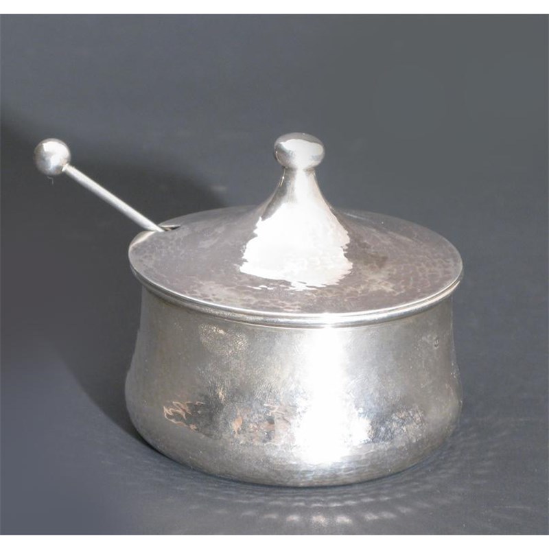 An A.E.Jones silver preserve pot, cover and spoon, with glass liner, model no.1122, with hammered finish, stamped marks, Birmingham 1931 9cm. high