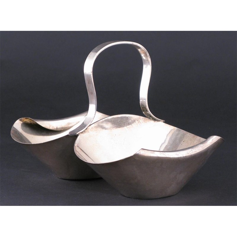 A Roberts and Belk electroplated sweet-meat dish designed by Dr Christopher Dresser, model no.2700, twin compartment with central loop handle stamped marks 21cm. wide