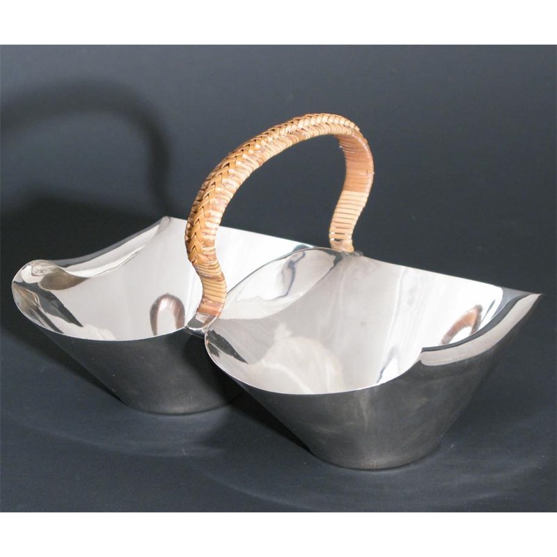 An Elkington electroplate twin bowl dish designed by Dr Christopher Dresser, model no.17618, with wicker bound central handle stamped marks 20cm. wide
