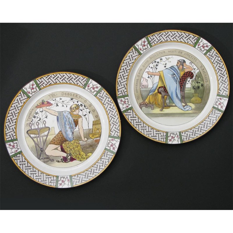 Anacreon a pair of Minton dessert plates designed by John Moyr Smith, printed and painted in colours impressed and painted marks 25.5cm. diam. Literature Annamarie Stapleton John Moyr Smith A Victorian Designer Richard Dennis Publications, these plates illustrated page 56