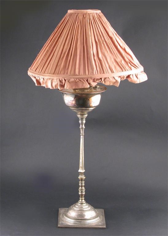 A W.A.S Benson silvered brass electric light square rim with stepped circular foot, central turned column stamped W.A.S Benson to reservoir, converted from an oil lamp height to shade 51cm. high Literature Ian Hamerton W.A.S Benson ACC, page 248 plate 3 for comparable variations on this design