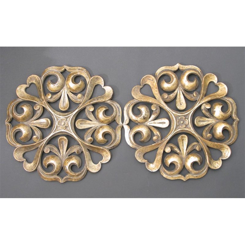 A pair of carved wood roundels pierced design of fleur de lys, gilded unsigned 30.5cm. diam.