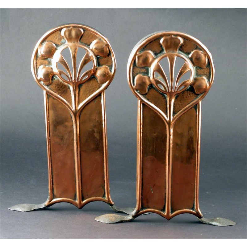 A pair of copper and iron firedogs stamped and pierced with an Art Nouveau floral design unsigned...