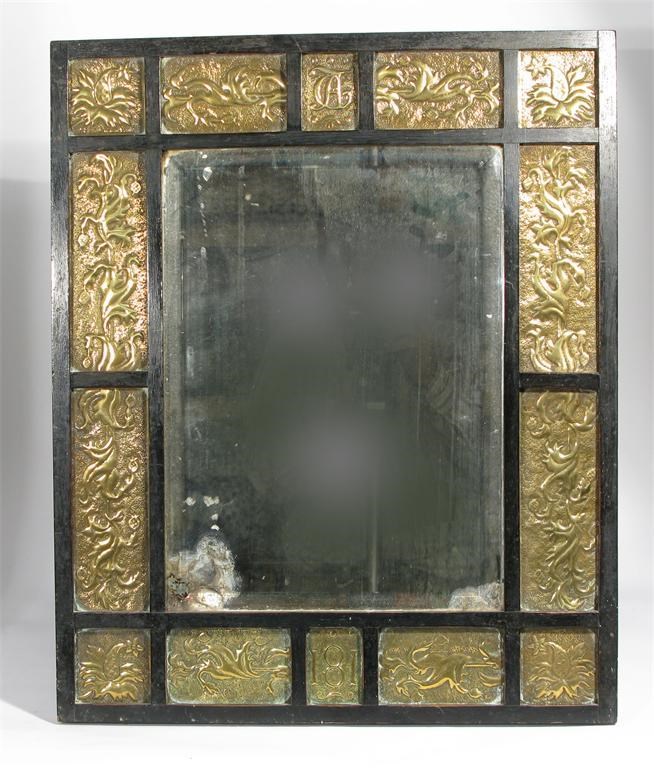 An Aesthetic Movement ebonised wood and brass wall mirror rectangular, the brass panels stamped with foliate motif, one stamped 181 unmarked 56 x 46cm.