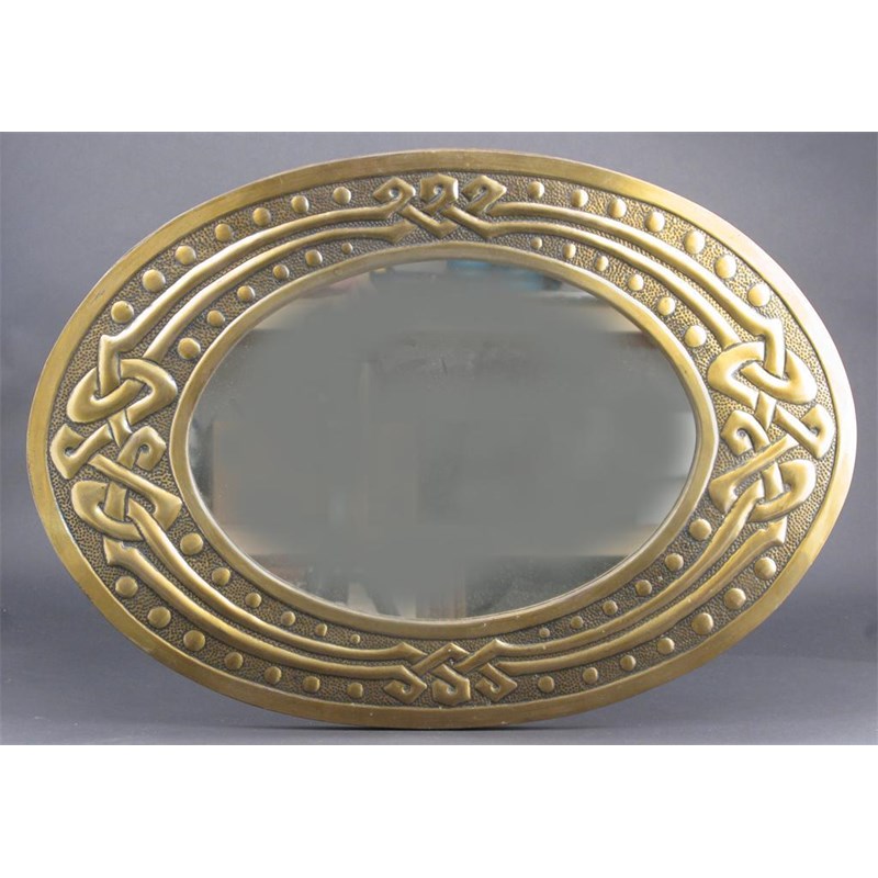 A Glasgow School brass mirror elliptical form, stamped in low relief with Celtic knot border unsigned 60cm. wide