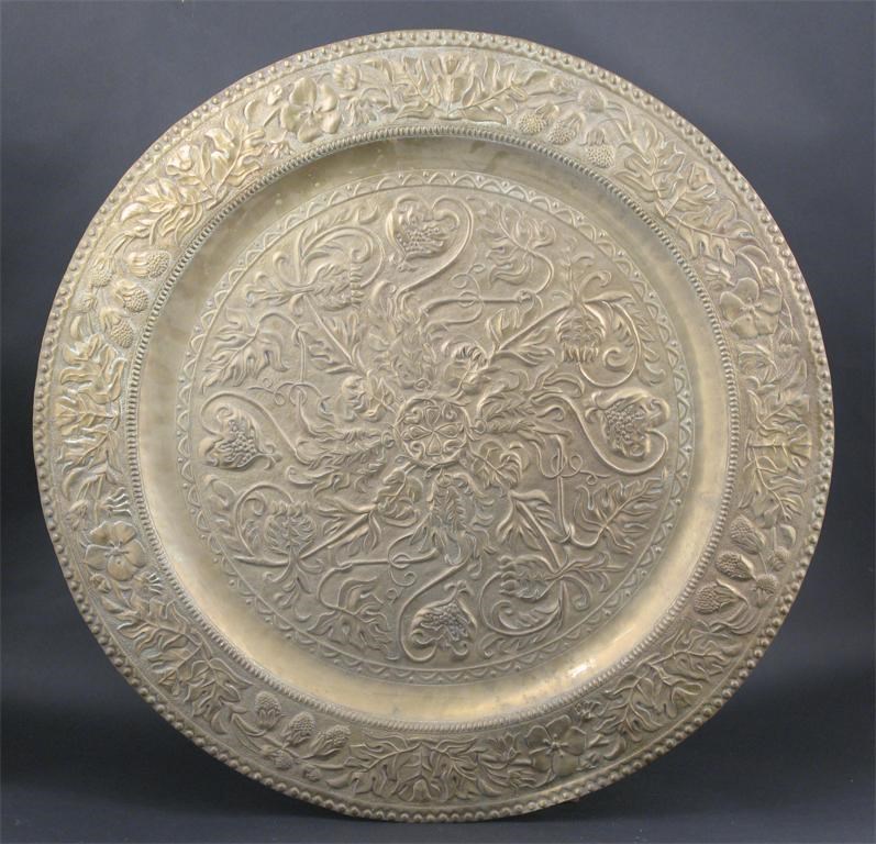 A large Keswick School of Industrial Arts brass charger hammered and worked with scrolling pomegranate and foliage to the well, the rim with flowers and foliage stamped KSIA mark 58.5cm. diam.