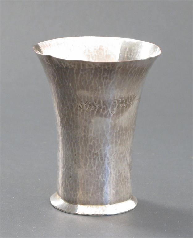 A Keswick School of Industrial Arts electroplated beaker vase hammered form, with inscription stamped Keswick KSIA E361 9.5cm. high
