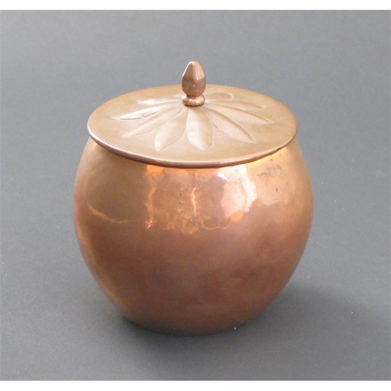 A Keswick School of Industrial Arts copper pot and cover hammered form, the cover with hammered flower motif stamped KSIA 11cm. high