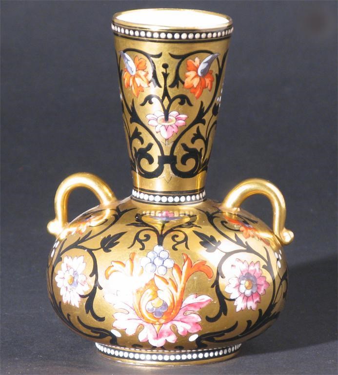 A Minton Aesthetic Movement twin-handled vase printed and painted with scrolling flowers and foliage, highlighted in gilt unmarked 14cm. high