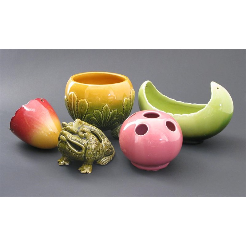 A Wardle Potttery grotesque figure modelled as a bull frog, glazed olive a flower vase and three other items unmarked 13cm. wide