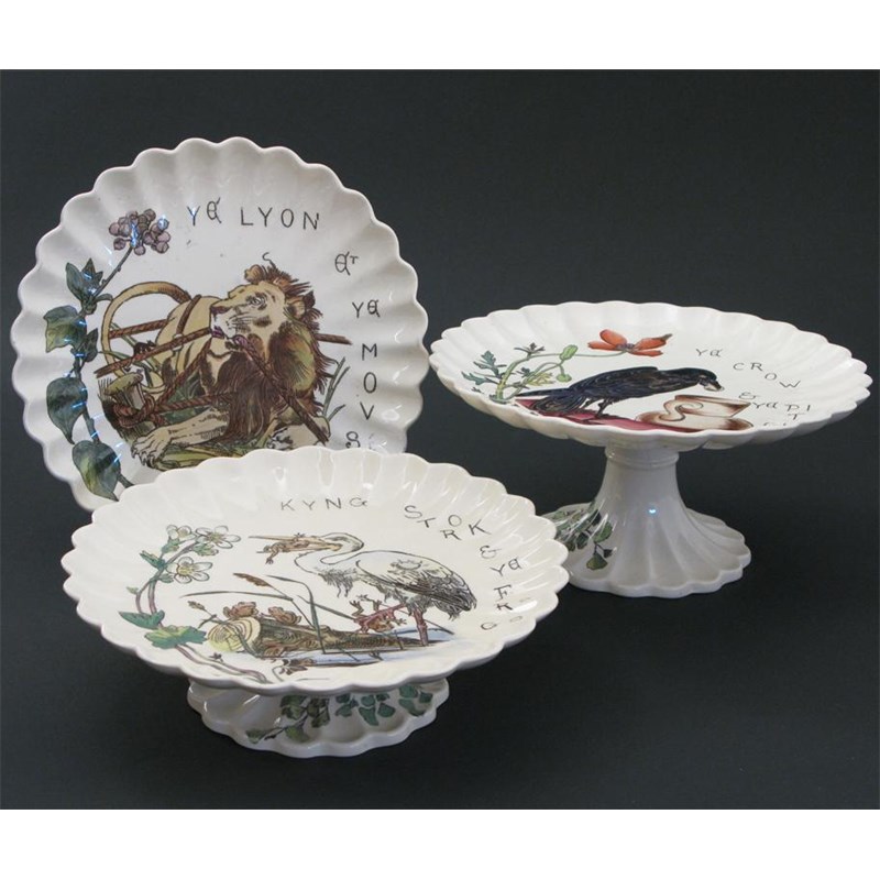 A Copeland Aesthetic Movement earthenware part dessert set fluted rims, printed and painted with Aesop's Fables, comprising; a tazza, two low tazza and four plates impressed marks, damages 21cm. diam.