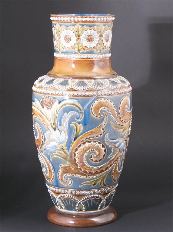 A large Doulton Lambeth stoneware vase by Elisa Simmance, incised and applied with scrolling flowers and foliage with beadwork decoration, in shades of blue, green and brown impressed mark, incised monogram, damages 47cm. high