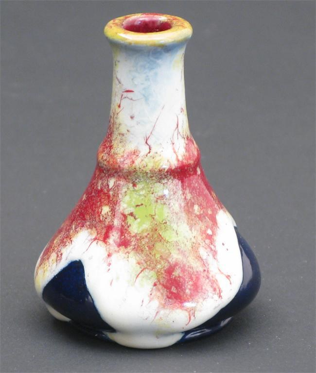 A rare Royal Doulton Chang miniature vase covered in a running white, red and green glaze over blue impressed mark 7cm. high
