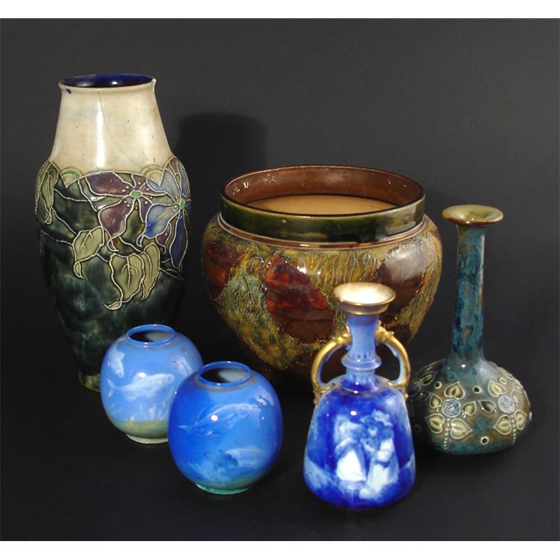 A Royal Doulton stoneware Natural Foliage jardiniere two vases, and a small collection of ceramics including Flambe and Series Ware various marks, damages jardiniere 16cm. high