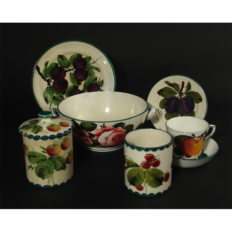 A Wemyss Pottery preserve and cover painted with strawberries, a preserve with raspberries, and four other items various painted marks, damages 12.5cm. high