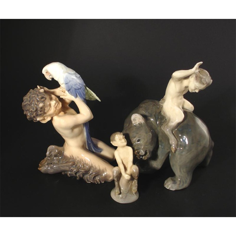 'Faun with Parrot model no.752' a Royal Copenhagen figure designed by C Thomsen, Fawn on Stump 1738 and fifteen other mythological figures various marks, minor damages