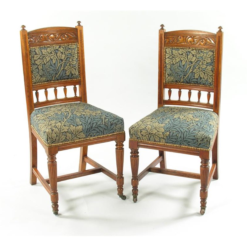 A set of six English Aesthetic Movement oak chairs tapering rectangular backs with carved fruiting foliage panel and turned finial with later William Morris upholstered back and seat, front legs with casters 101cm. high