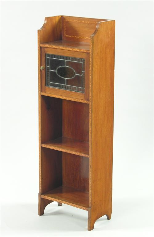 A mahogany bookcase in the style of Wylie & Lochhead, with leaded glass door panel, the shelf and sides inlaid with a band of chequers unmarked 94cm. high