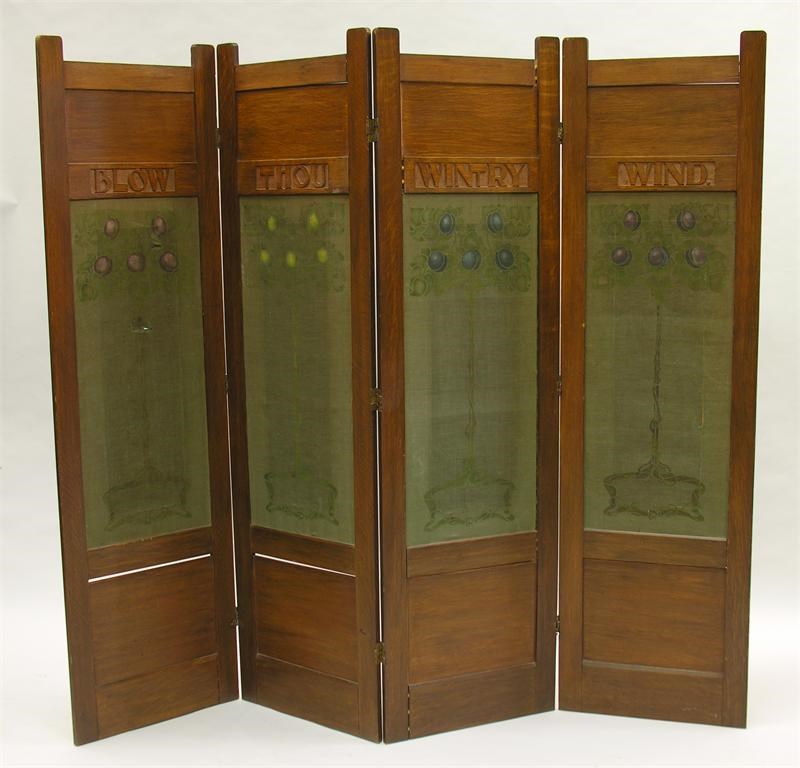 A Scottish School oak four fold screen carved with the inscription 'Blow Thou Wintry Wind'