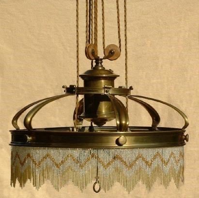 An Arts and Crafts brass hanging light with glass bead shade unmarked 47cm. diam.