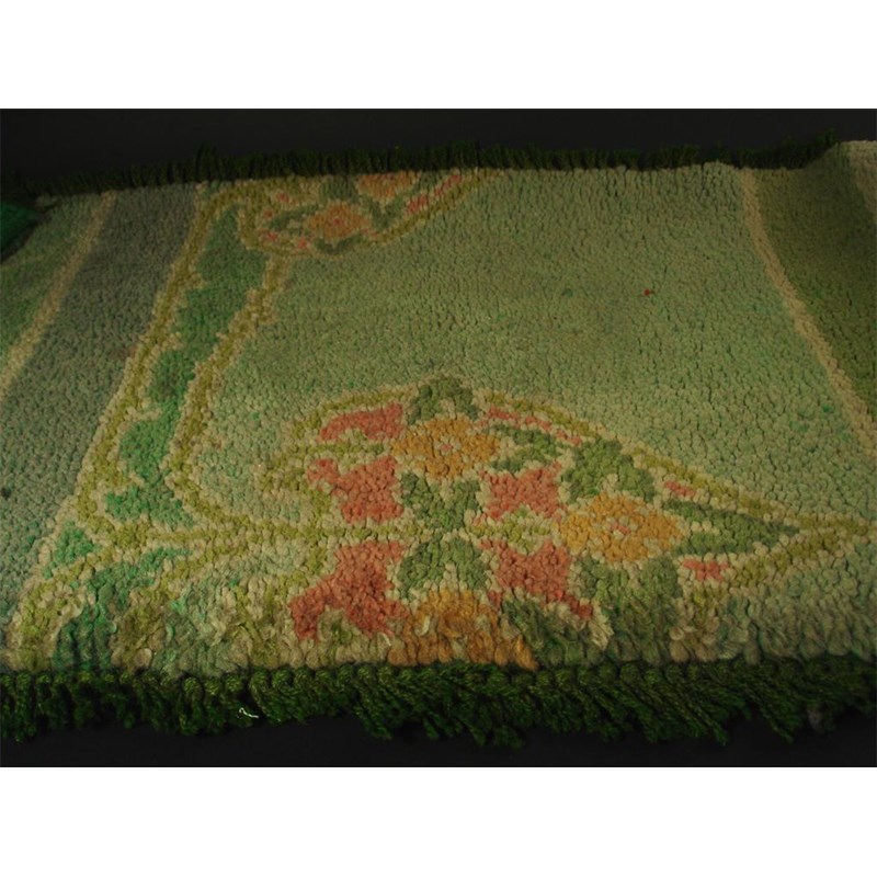 A Donegal carpet sample designed by C F A Voysey probably for Liberty & Co, simple floral heart cartouche on a green ground, with linen loom guides 113 x 56cm.