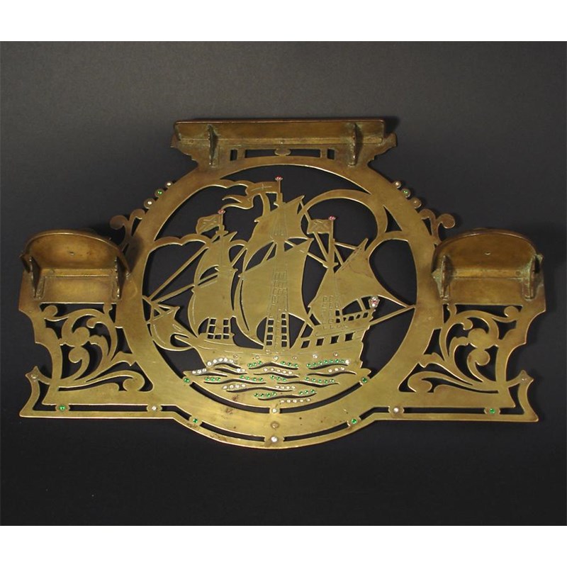 A brass wall sconce, pierced form decorated with a galleon at full sail, the sea set with stones unmarked 37cm. wide