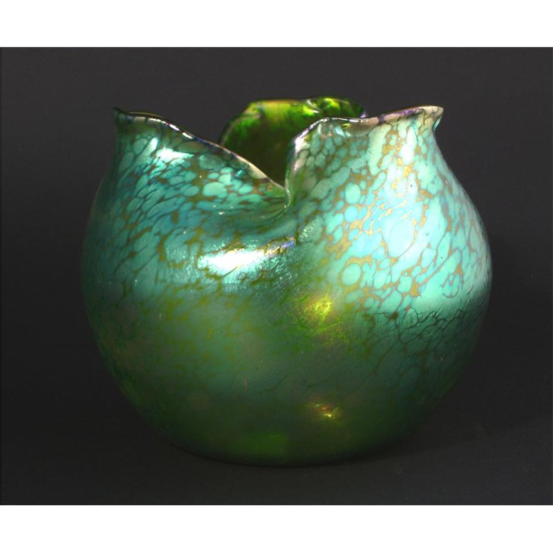 A Loetz glass vase ovoid form with trefoil pinched rim, covered in a splashed iridescence unmarked 14cm. high